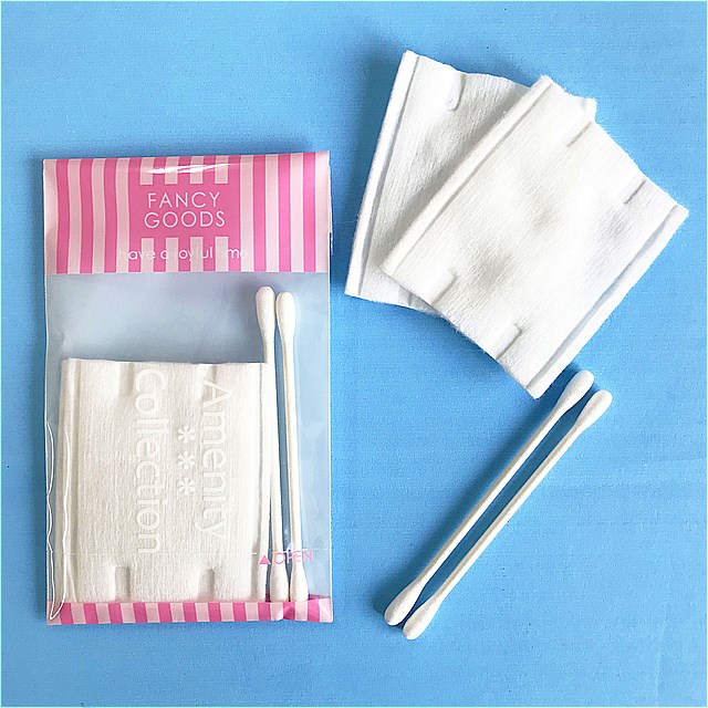 コットン2枚、綿棒2本の低価格コットンセット。女性用の宿泊アメニティとしてはもちろん、パウダールームのお化粧直し用としてもお使いいただけます。