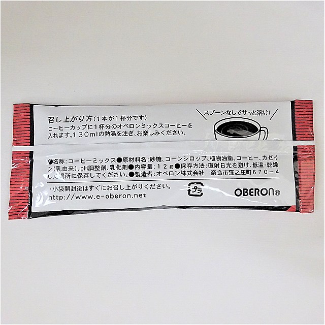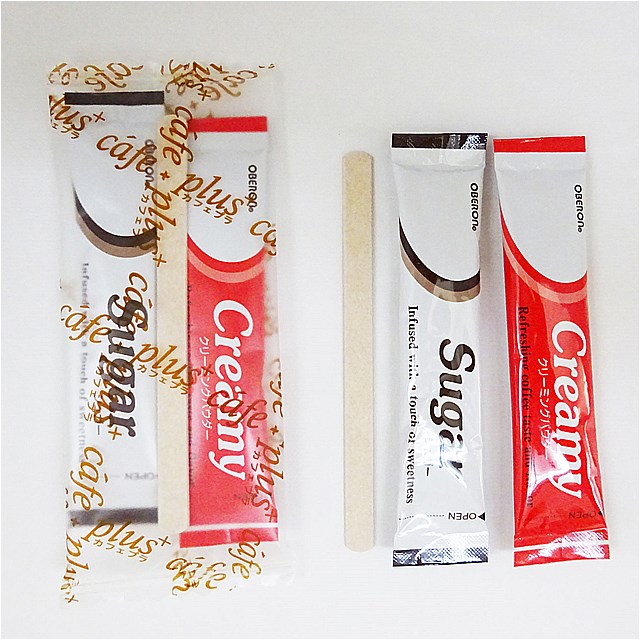 オベロン100コーヒー・ミルク・シュガーをかわいいフィルムで個別包装にしました。 また、環境に配慮した紙マドラー入りです。