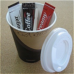 オベロン100コーヒー・ミルク・シュガー・マドラーをシックでオシャレな紙コップに1人分づつセットし、フィルム包装しています。