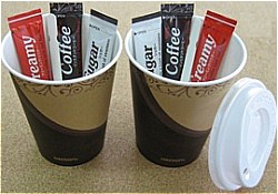 オベロン100コーヒー・ミルク・シュガー・マドラーをシックでオシャレな紙コップに2人分づつセットし、フィルム包装しています。 1人用を2つ買うよりお得です。