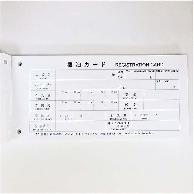 チェックイン時に必要となる宿泊カードです。パスポート番号や英字表記も追加し、より使いやすいものにリニューアルしました。外国人観光客の方にも対応可能です。