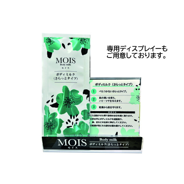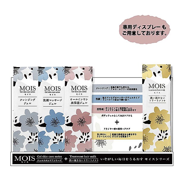 人気のMOISシリーズにボディミルクが新登場!洗い流さないトリートメントと高品質スキンケアパウチも一緒になった贅沢5点セット!スキンケアパウチはすべてジェルタイプの仕様になっているので、忙しい毎日にぴったりの簡単スキンケアシリーズです。お部屋のアメニティとしてはもちろん、ノベルティやギフトにも最適な台紙セットになっています。