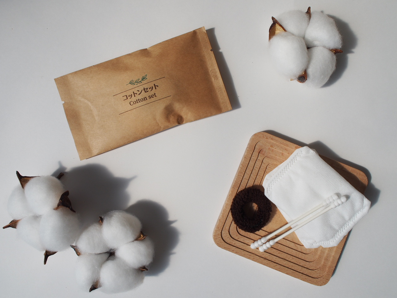 国産エチュールコットン2枚、スパイラル綿棒2本のセット。女性用の宿泊アメニティとしてはもちろん、パウダールームのお化粧直し用としてもお使いいただけるセットです。