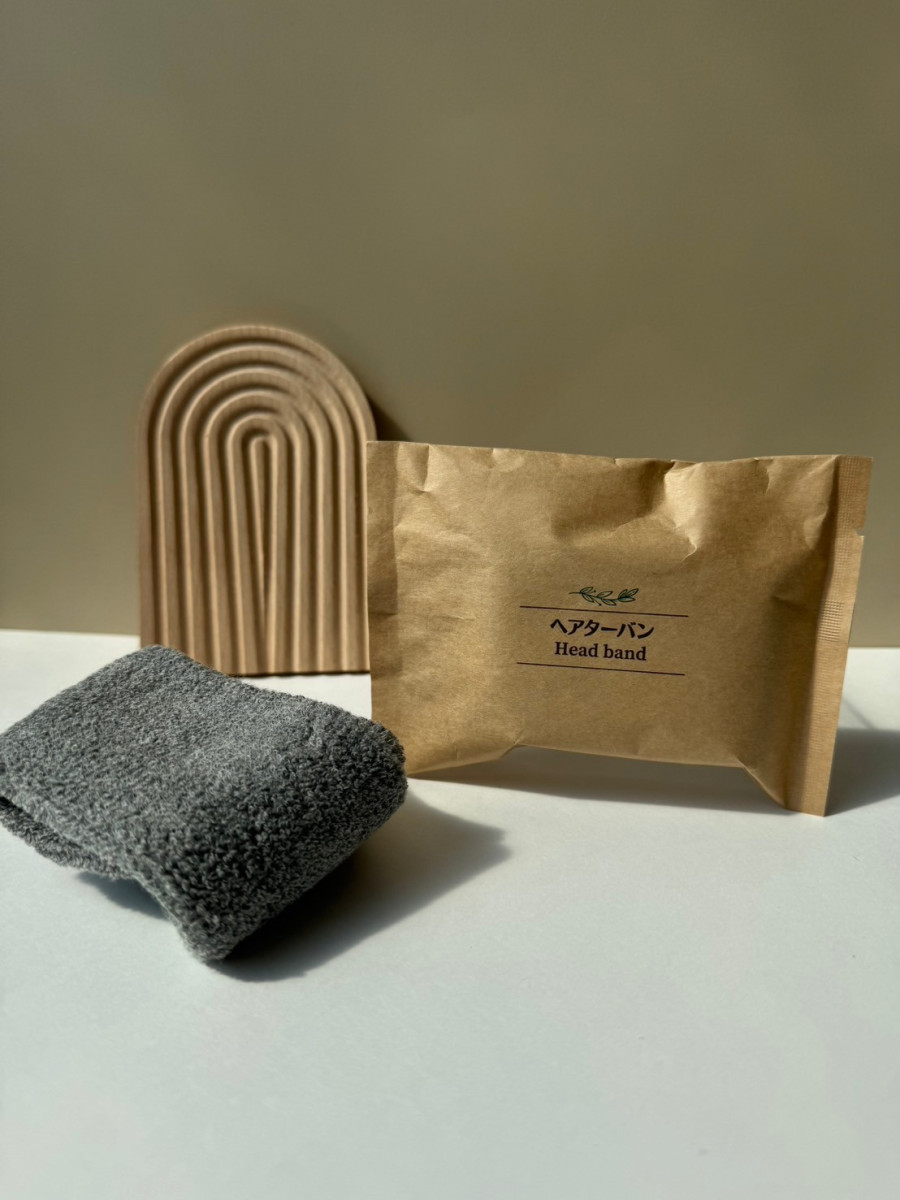 国産エチュールコットン2枚、スパイラル綿棒2本、ヘアバンド茶1個のセット。女性用の宿泊アメニティとしてはもちろん、パウダールームのお化粧直し用としてもお使いいただけるセットです。