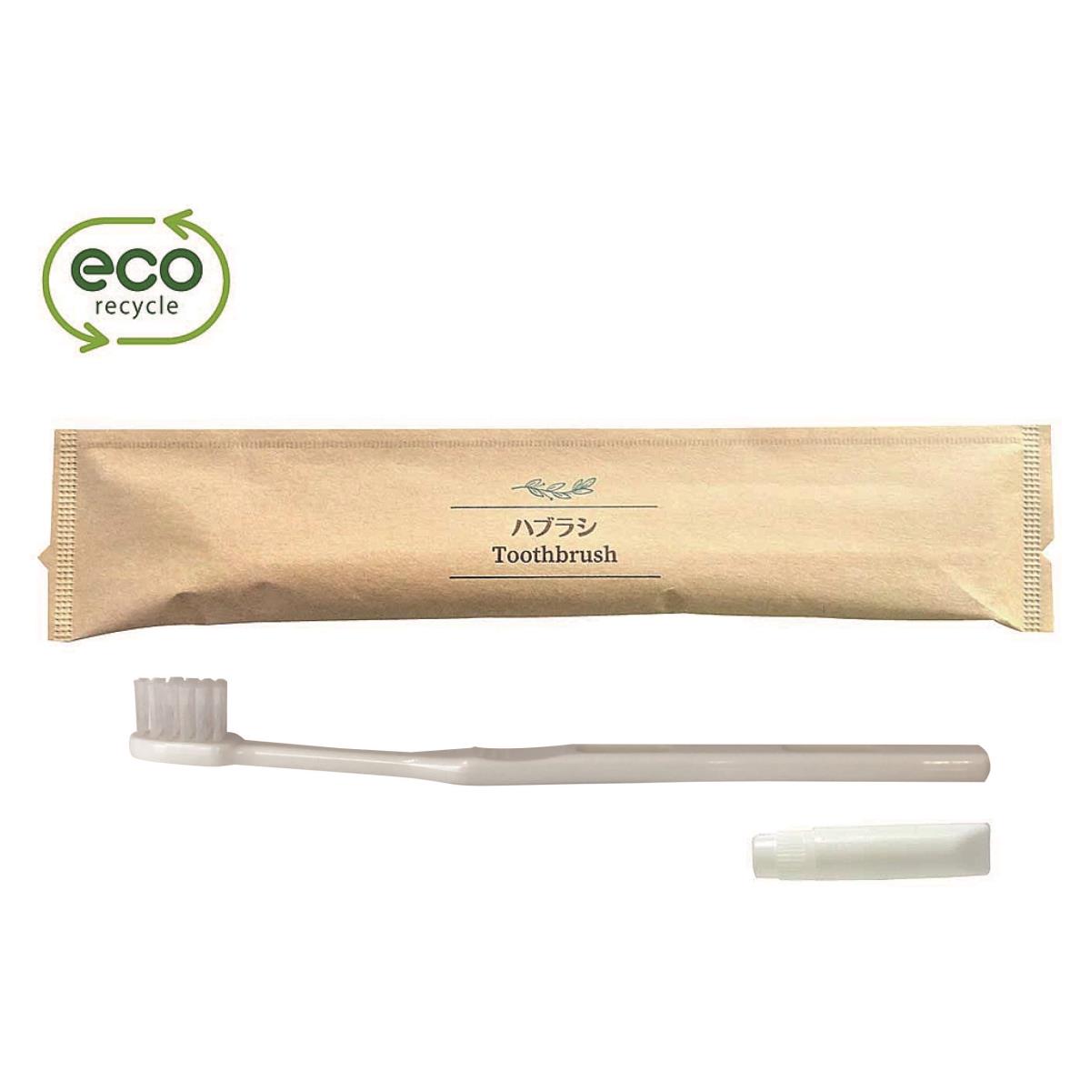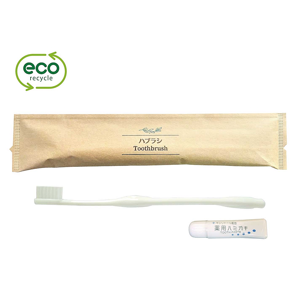 ハンドル部分リサイクル樹脂量100%の国産ハブラシ。キシリトール入り薬用ハミガキ3gのセットです。ご希望の施設様には初回導入時に、お部屋数分の「国産薬用ハミガキカード」を無償でご提供させていただきます。